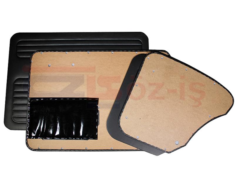 All holes of clips, windows, and door handles are on the wooden board. There are no holes in the vinyl covering.